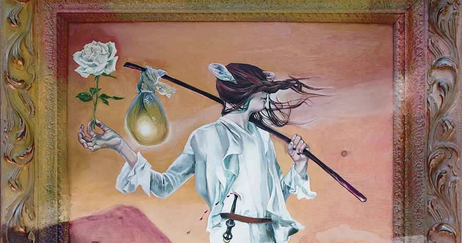 welcome! I paint magical realism of a greater realism. My works are oil paintings on wood panel, painted onto and escaping the frame and perhaps reality as well. Ancient symbols and art blend with poetic considerations of our human experience. I paint to try to capture a timelessness, of being a human living our wonderful challenging lives on this beautiful world. These paintings are then vehicles to carry that idea. Traditionally our cultures painted zoomorphic images to represent spirituality, aspects of God, a timeless force. These chimeras capture the awe of the viewer with their strangeness. In the same way, my landscapes and figurative works act as symbolic reflections of that journey. I hope my paintings tap into this 'Mystic' as modern-day totems residing in their everyday existence, just as we are individual spiritual people living odd and humorous and hard and normal everyday lives. I am interested in transformation, in breaking through our paradigms.